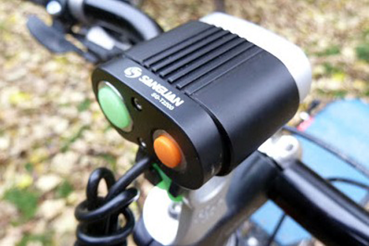 Фонарь SANGUAN SG-T2200 образует мощное равномерное освещение на расстоянии до 50 метров. Отсутствие световых границ между зонами освещения, очень комфортно для глаз. В отличие от модели SG-N2200, данный фонарь слабее захватывает зоны справа и слева от колеса велосипеда (видно на тестовом фото). 2 светодиода работают от выносного блока аккумуляторов (6600mAh, 7,4V) который можно заряжать от сети 220В, с помощью зарядного устройства. Время полного заряда - 4 часа. Сила светового потока 2200лм. 4 режима работы: 100% (до 3 часов), 70%, 40%, 10%. А также, импульсный режим, который включается отдельной кнопкой, что удобно для быстрого перехода между постоянным освещением дороги и сигнализацией импульсами. Например при проезде через нерегулируемый перекрёсток. Индикатор заряда встроен в кнопку включения, и сигнализирует тремя цветами об уровне заряда аккумулятора: 100-70%(зелёный), 70-40%(синий), 40-10%(красный), красный моргающий - менее 10%. Фонарь может быть закреплён на руль велосипеда (резиновыми хомутами), на голову велосипедиста или на шлем, с помощью налобного крепления.