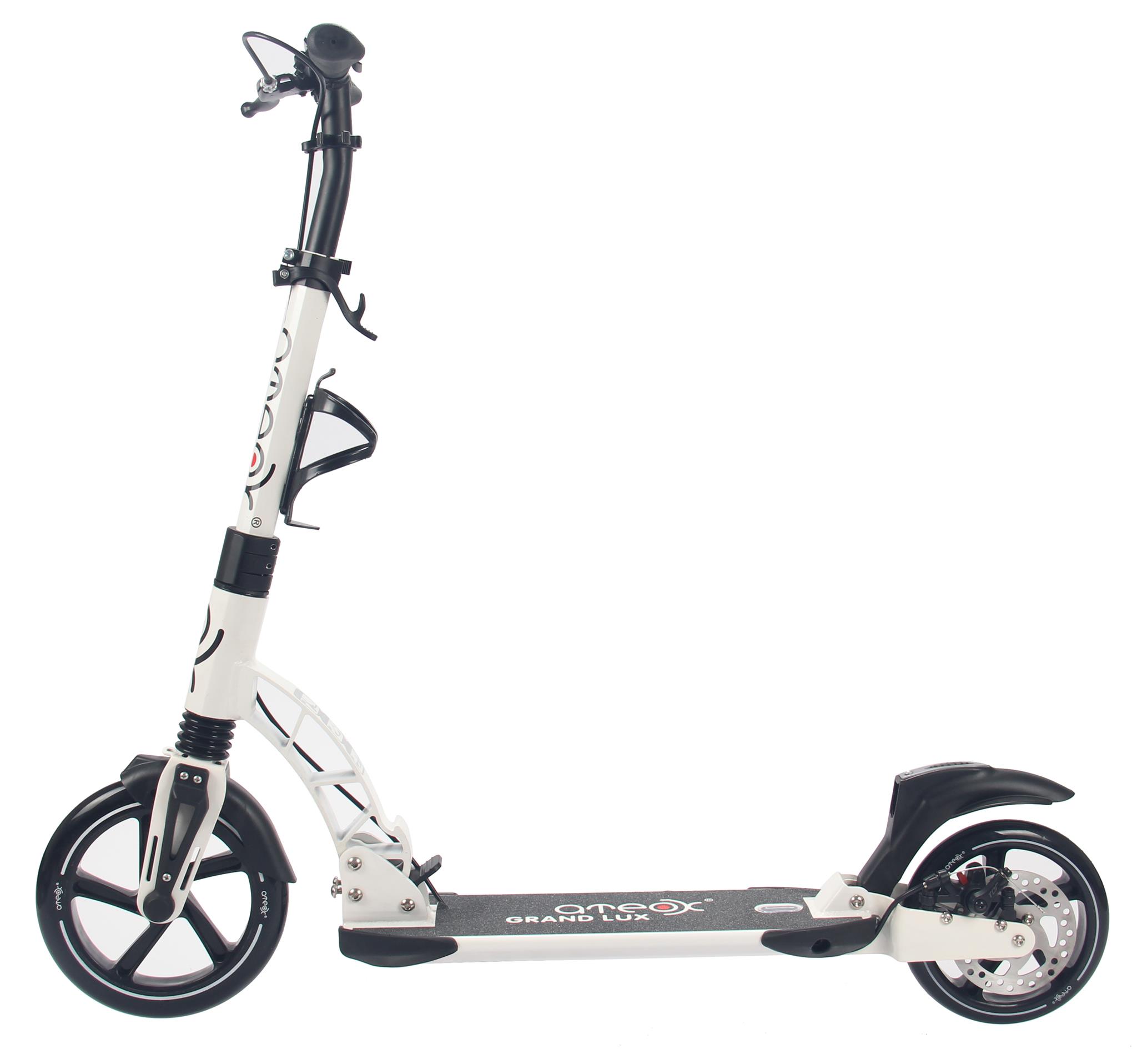 Самокат АTEOX GRAND LUX С РУЧНЫМ ДИСКОВЫМ ТОРМОЗОМ придется по вкусу тем, кто ценит комфорт и красоту и особенно тем, кто уже оценил качество АTEOX GRAND 230 и АTEOX GRAND PRO . Необычный, но при этом сдержанный дизайн будет радовать глаз, а большая, самая длинная в линейке АTEOX, дека позволит чувствовать себя уверенно даже не очень опытному райдеру. В нем есть все - от невероятно легкой и надежной системы складывания, до фиксатора рукояток руля. Надежные, с прекрасным накатом (благодаря подшипникам поколения ABEC 7 Chrome) полиуретановые колеса держат сцепление с поверхностью дороги просто идеально, а теперь эта прекрасная модель дополнена и надежным ручным дисковым тормозом. Мы уверены, что самокат АTEOX GRAND LUX завоюет ваши сердца!